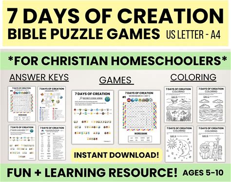 7 Days Of Creation Bible Homeschool Pack - Christian Learning Activity & Puzzle Game - Genesis Story Printables And Coloring Pages Ages 5-10